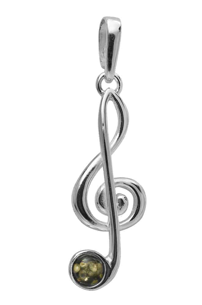 clef and a single, subtle orb of sparkling Baltic amber. Also known as the violin clef or the G clef, this symbol is held dearly by individuals for whom music is more than just notes and melody. The green of the genuine amber circle features shimmering internal inclusions that catch the light from every angle. The delicate curves of the silver clef reflect the classic symbol of music and the love of