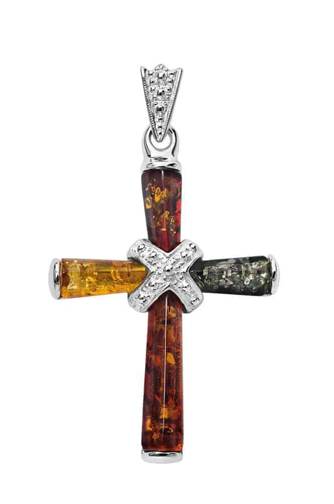 flecks refract and reflect light from within the center of each gemstone. A symbol of religion, strength, faith, perseverance and love, this amber cross pendant is eternally bound by .925 sterling silver for longevity and beauty. The multicolored arms of the cross add to the piece’s singularity, making it the perfect gift for anyone who always strives to be an individual while maintaining oneness with God. Because every piece of pure Baltic amber jewelry was brought directly to New York from Poland, you can rest assured in the knowledge that your beautiful cross pendant is 100% unique and genuine.